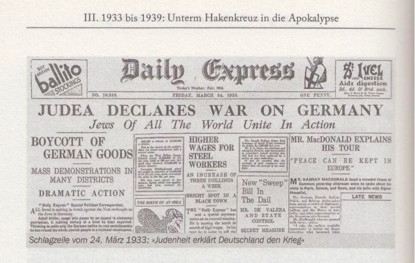 Nach der Schlagzeile und den Überschriften „Juden in aller Welt einig“, „Boykott deutscher Waren“, „Massendemonstrationen“ folgte der Frontartikel des Deutschlandkorrespondenten (Delmer zugesprochen): Rund um die Welt ist sich Israel ganz einig, „Deutschland wirtschaftlich und finanziell den Krieg zu erklären“. Ganz Israel sei zunehmend in Wut über den Angriff der Nationalsozialisten auf die Juden. Adolf Hitler würde nun die deutsche Nation im patriotisch verklärten Rassenbewusstsein zusammenschweißen. Damit hätte er aber das gesamte jüdische Volk zur nationalen Renaissance erweckt. Das Hakenkreuz als Symbol des neuen Deutschlands hätte das alte Kampfzeichen des jüdischen Widerstands, den Löwen von Juda, wieder herbeigerufen. Die über vierzehn Millionen über die ganze Welt verstreut lebenden Juden hätten sich wie ein Mann zusammengeschlossen, um den deutschen Verfolgern ihrer Glaubensbrüder den Krieg zu erklären. „Differenzen und Feindschaften hier und da sind beigelegt angesichts des gemeinsamen Zieles – den 600.000 Juden Deutschlands beizustehen, die durch Hitlers Antisemitismus terrorisiert werden, und das faschistische Deutschland zu zwingen, seine gewaltsame Unterdrückung der jüdischen Minderheit zu beenden.“ (3) Die Stellungnahme des Daily Express erscheint umso bedeutungsvoller, als es sich bis zum Sommer 1932 dem Nationalsozialismus mit besonderer Sympathie zugwandt hat. Sefton Delmer, dessen Berliner Korrespondent hatte mit Hitler gemeinsam den Deutschland-Flug zur Zeit des zweiten Wahlgangs um die Reichspräsidentschaft durchgeführt und sich dabei durch enge Vertrautheit mit den führenden Persönlichkeiten des Nationalsozialismus ausgezeichnet. Nun unterstützte er die Front gegen ein antisemitisches Deutschland. Am Abend notierte Goebbels in sein Tagebuch, dass ihnen die ausländische Greuelpropaganda viel zu schaffen mache. „Die vielen aus Deutschland emigrierten Juden erhetzen das ganze Ausland gegen uns.“ (4) Einen Tag nach Erscheinen des Daily Express wurden die Führer jüdischer Organisationen offenbar aus Anlaß einer von amerikanischen Zionisten unter Rabbi Stephen Wise für den 27. März im New Yorker Madison Square Garden einberufenen Protestversammlung gegen die Judenverfolgung in Deutschland zu Göring beordert. Sofort nach der Unterredung schickten der „Central-Verein“ (C.V.) und die „Zionistische Vereinigung für Deutschland“ (auch ZVfD), ein zionistischer Dachverband jüdischer Organisationen in Deutschland von 1918 bis 1934. eine gemeinsame Delegation nach London, während Telegramme mit der Bitte nach New York gingen, den Protestmarsch abzusagen. „Mein Aufsatz gegen die Greuelhetze erscheint im Sunday-Expreß und wirkt gut“, notierte Goebbels befriedigt am 26. März: „Er verschafft uns in England einige Erleichterung“. (5)